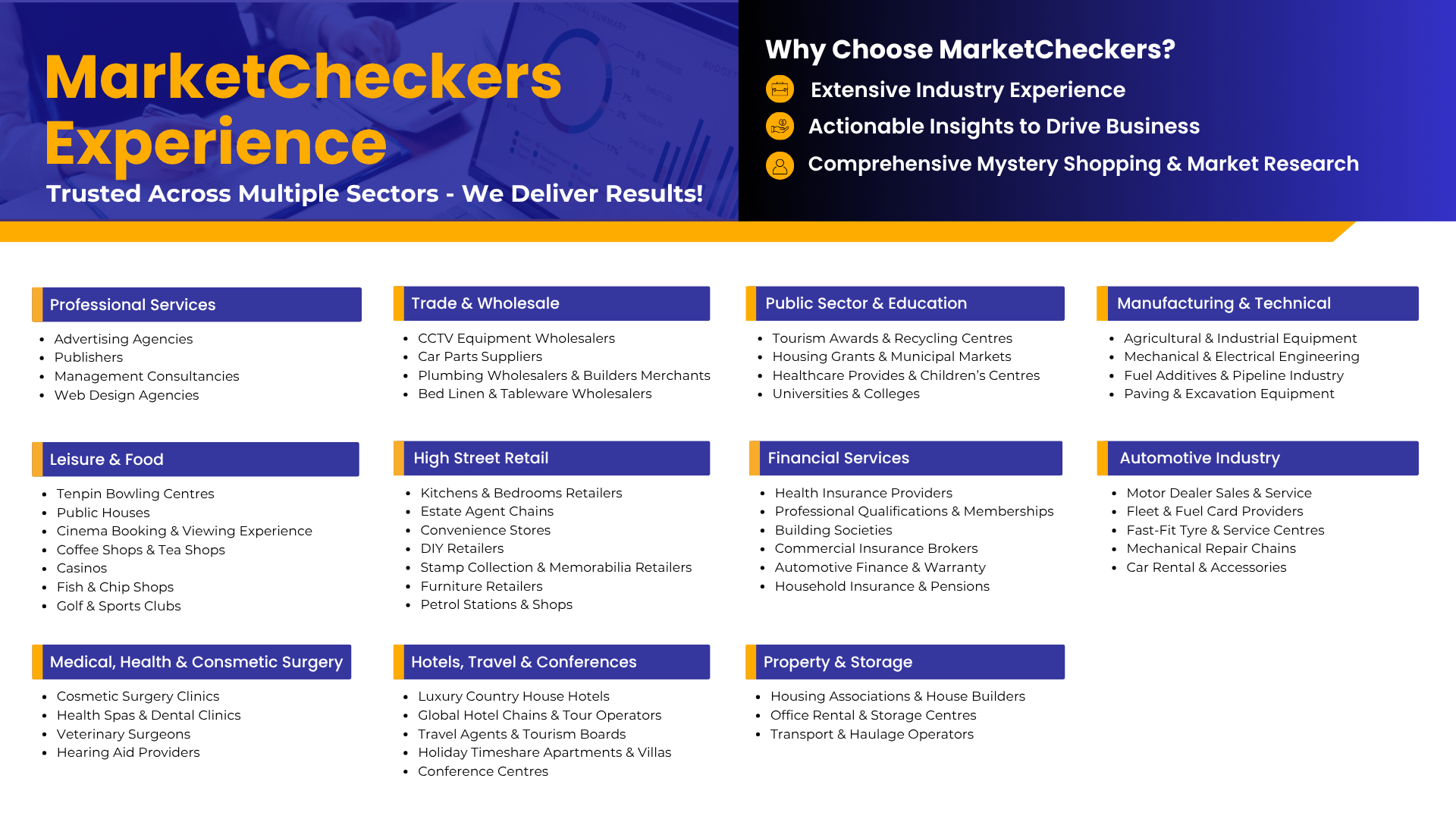 From Research to Telecoms solutions and Card Payment systems, MarketCheckers provides the insights and support you need to drive growth